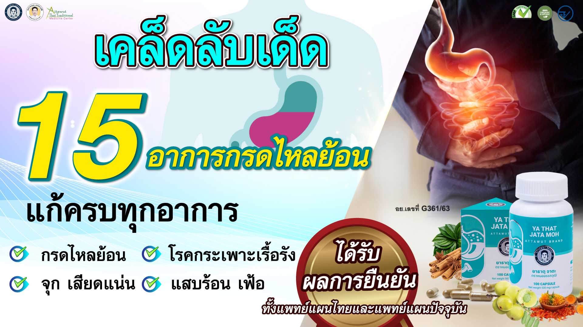 - สูตรสมุนไพรตำรับสกัดเฉพาะ กว่า 26 ชนิด รักษาลึกถึงต้นตอโรคกระเพาะ กรดไหลย้อน จุกเสียดแน่น ลมตี ครบทุกกลไก