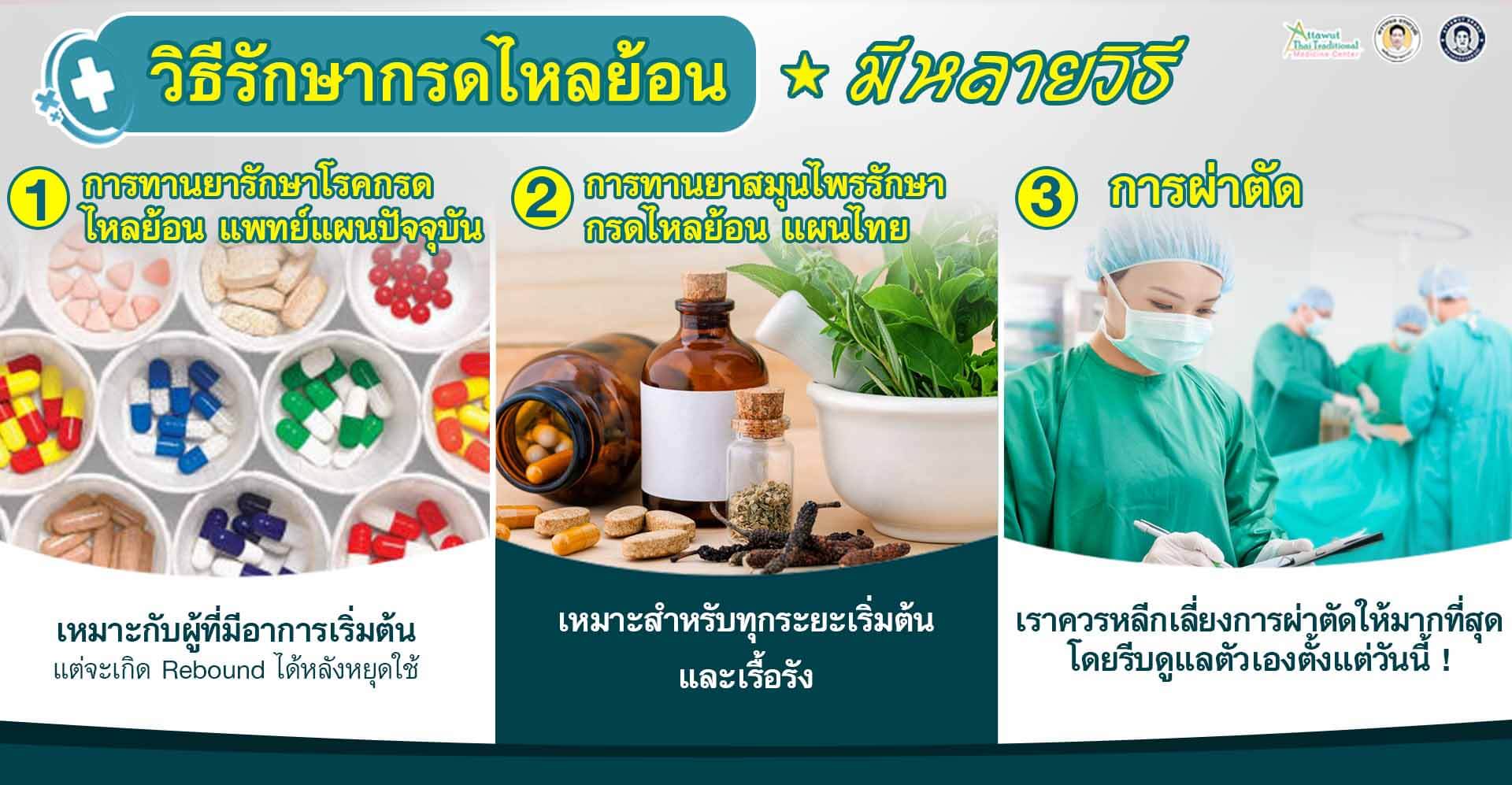 - การรักษากรดไหลย้อนด้วยยาสมุนไพร สูตรตำรับที่ปรุงโดยแพทย์แผนไทยจะได้คุณสมบัติในการแก้ประกอบกันทุกกลไกตั้งแต่ ขับลม บำรุงกระเพาะ บำรุงน้ำดี ฟื้นฟูระบบย่อยอาหาร สมานแผลในกระเพาะ และลดการอักเสบภายในทางเดินอาหารตลอดแนว ไล่ลมลึก โดยใช้ติดต่อกัน ไม่เกิด REBOUD เหมือนยาเคมี