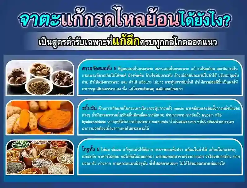 “ยาสมุนไพรรักษากรดไหลย้อน แก้กรดไหลย้อน ท้องอืด ขึ้นคอ แก้จุกแน่น อาหารไม่ย่อย แสบร้อน จุกลิ้นปี่ ลมในกระเพาะ ทั้งฉับพลันและเรื้อรัง  และอาการอื่นๆที่เกี่ยวข้อง แก้ไขลงลึกที่ต้นเหตุของโรค”