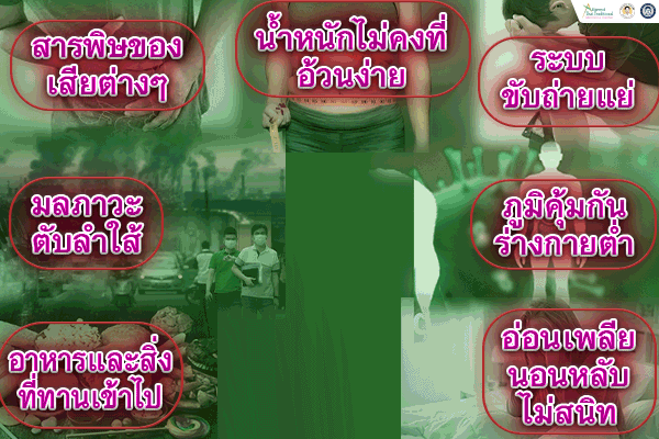 - เกิดอนุพันธ์ Free radical ทำลายเซลล์ดีในร่างกายมากขึ้นเรื่อยๆ ภูมิคุ้มกันร่างกายต่ำตาม ป่วยง่าย ภูมิแพ้ต่างๆ