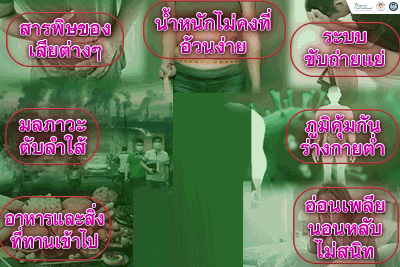 - อาหารหรือสิ่งที่ทานเข้าไป มลภาวะ ตับ ลำไส้ สะสมสารพิษ เมือกมันตระกัน ของเสีย ระบบขับถ่ายแย่