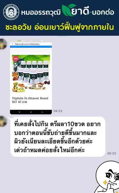 * ตรีผลา หมออรรถวุฒิ ไม่มี ส่วนผสมของยาระบาย จึงไม่ทำให้ท้องเสีย หรือถ่ายเหลวแต่อย่างใด จะช่วยปรับสมดุลขับถ่ายให้ปกติเท่านั้น *